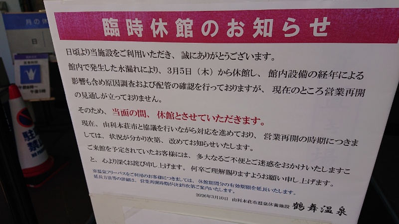 鶴舞温泉(秋田県由利本荘市西小人町23-1、日帰り入浴9:00-21:00)休業中