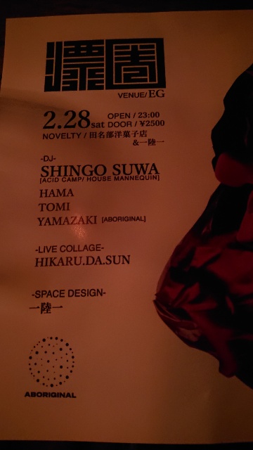 二次会はmotherでINNER、到着時はYAMAZAKIさん終わりかけ、すぐに pepinさんに交替、pepinさんが1時間回してSonoさん、という流れ。 しかし音の方はブレのない一貫したダークミニマルテクノ。パーティの芯が 本当にしっかりしてる。私も淡々と踊りまくる。 こちらでも強力な皆さんに新年のご挨拶。なんかいろいろ昔話だわ、東京 のクラブの昔話、さらにはスーパー戦隊の昔話(笑)。そんな盛り上がりも 楽しかった。(単なるオヤジの自慢話か、歴史を語り継ぐ伝承行為なのかは、 ご判断をおまかせしますw) まあとりあえず、今回は2/28空けとけ、って話ですね。EG酒場も6かく珈琲 も久しぶりに。ということで、大寒の週末にもガッツリ遊んでしまった。